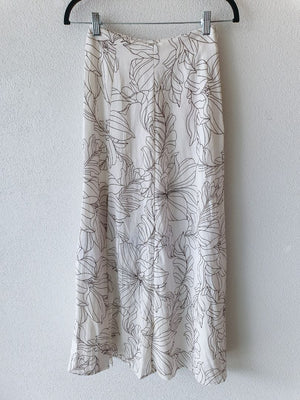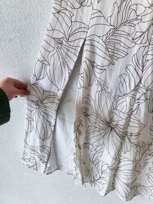 The Lyra Split Skirt sets the foundation for transeasonal looks. Made from a viscose blend, this skirt features a subtle chocolate floral pattern on a white base. The slightly A-line design sits high on the waist, fitted at the hips before flowing out to the hemline with effortless drape. Detailed with a subtle split, this midi skirt ensures versatility and ease of movement.