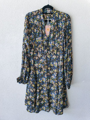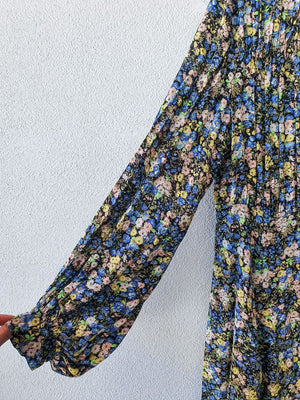 Crafted from a viscose weave with a floral all-over print, this dress is designed for a relaxed, romantic look. Cut to fall below the knee, it is styled with a cut-and-sewn with gatherings and long, billowy sleeves with buttoned cuffs. Detailed with a stand collar and a keyhole opening at front.