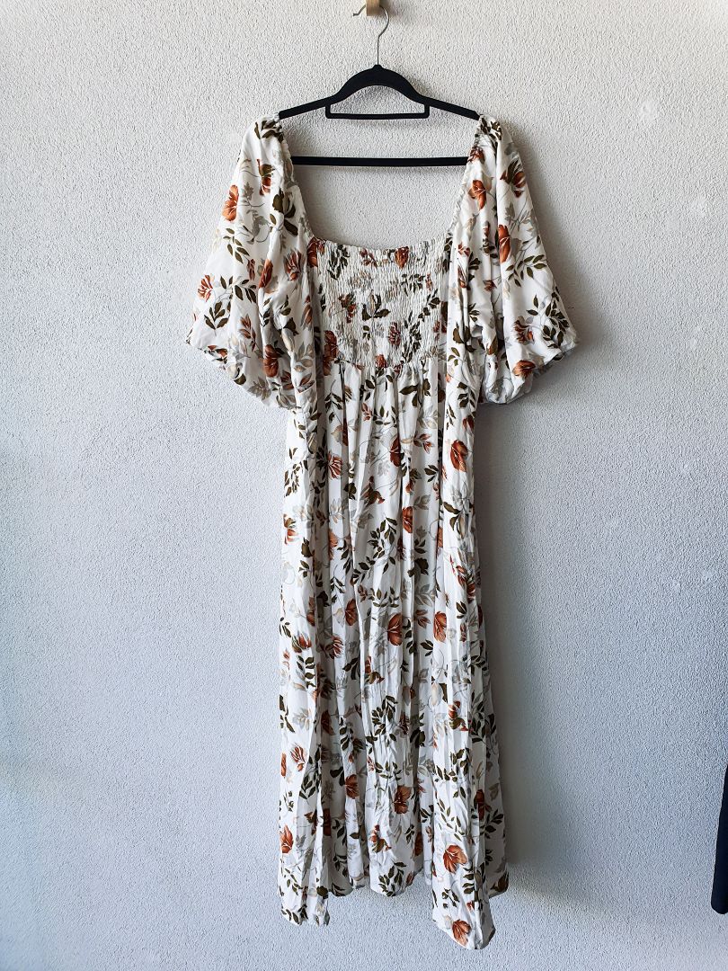 Floral maxi dress with elasticated short sleeves and buttons down front. Size tag removed.