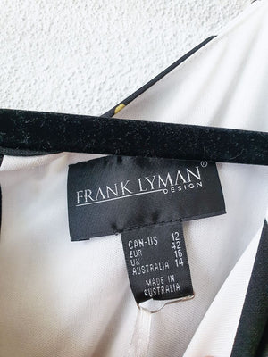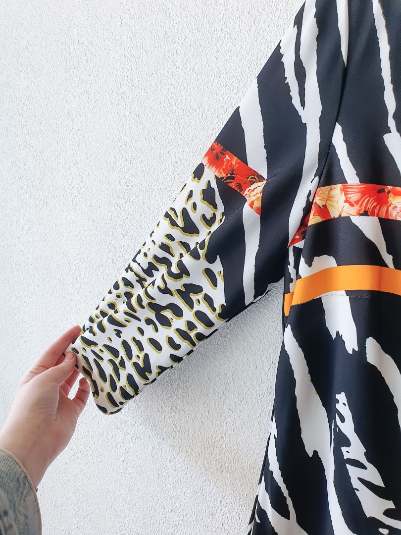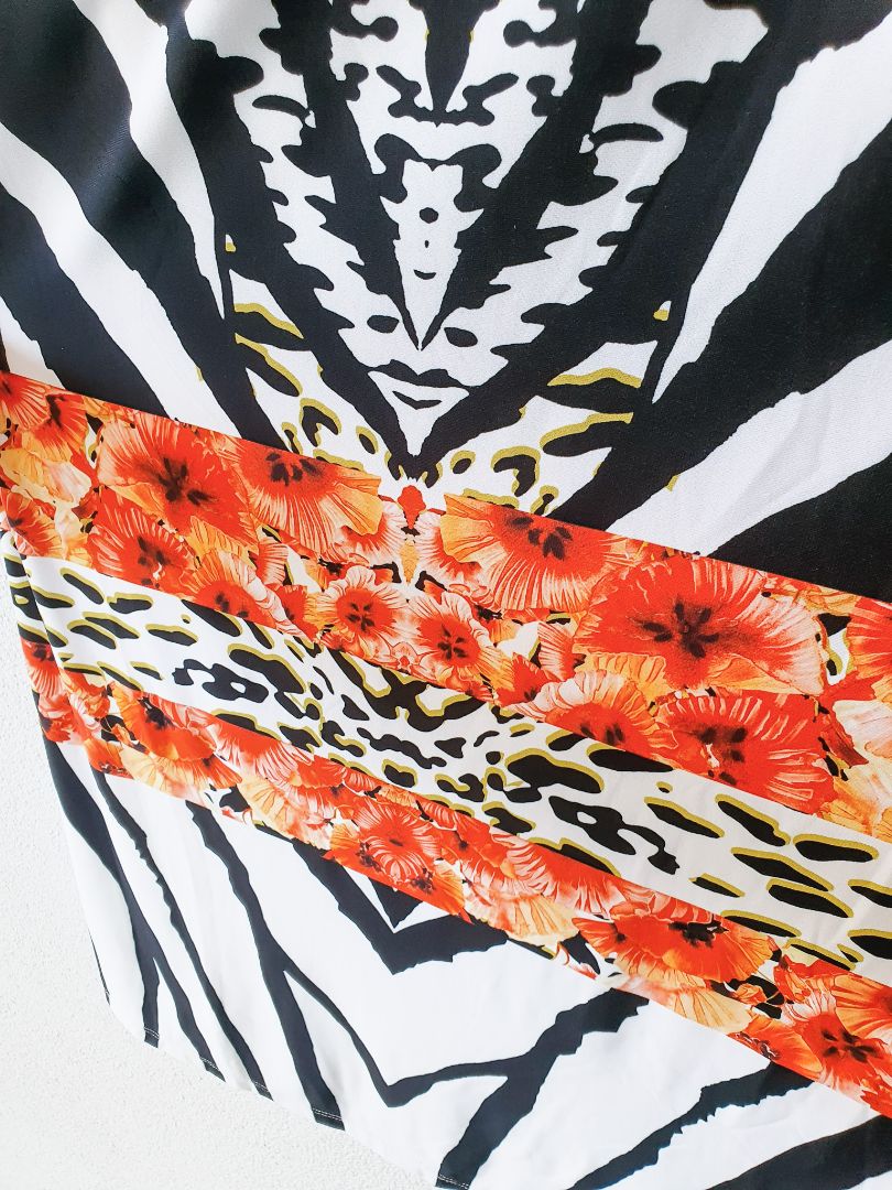 Make a statement with this sophisticated piece from Frank Lyman, known for their flattering cuts and travel-friendly fabrics. This dress combines a bold animal print with vibrant splashes of yellow and red florals, designed specifically to camouflage and flatter the figure.