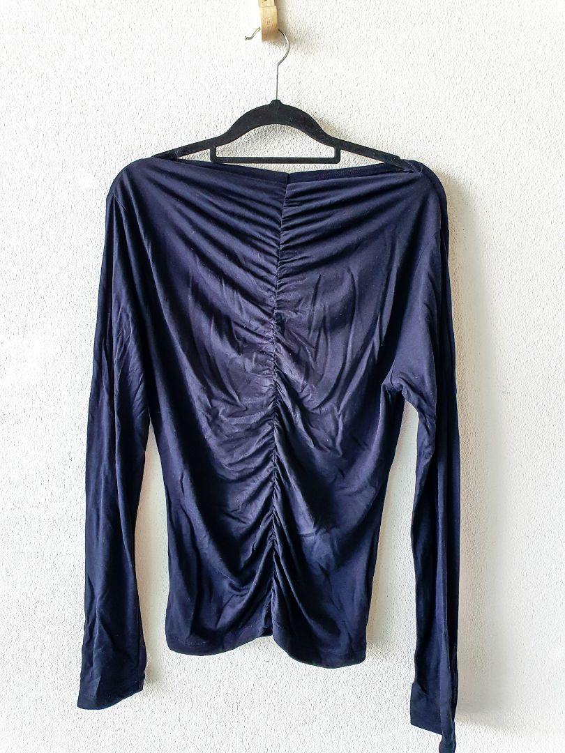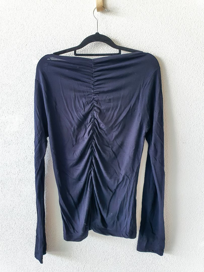 Long sleeve black top with ruched detail down front.