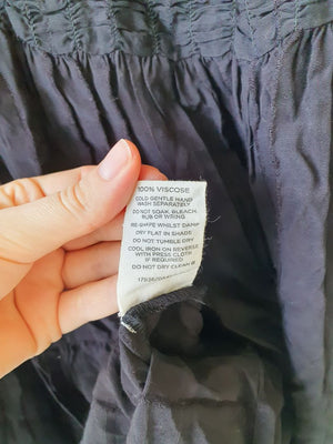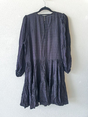 Long-sleeved mini black dress with ruched front detail and subtle stripes