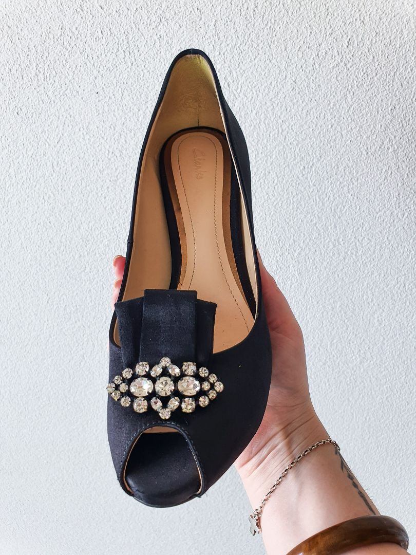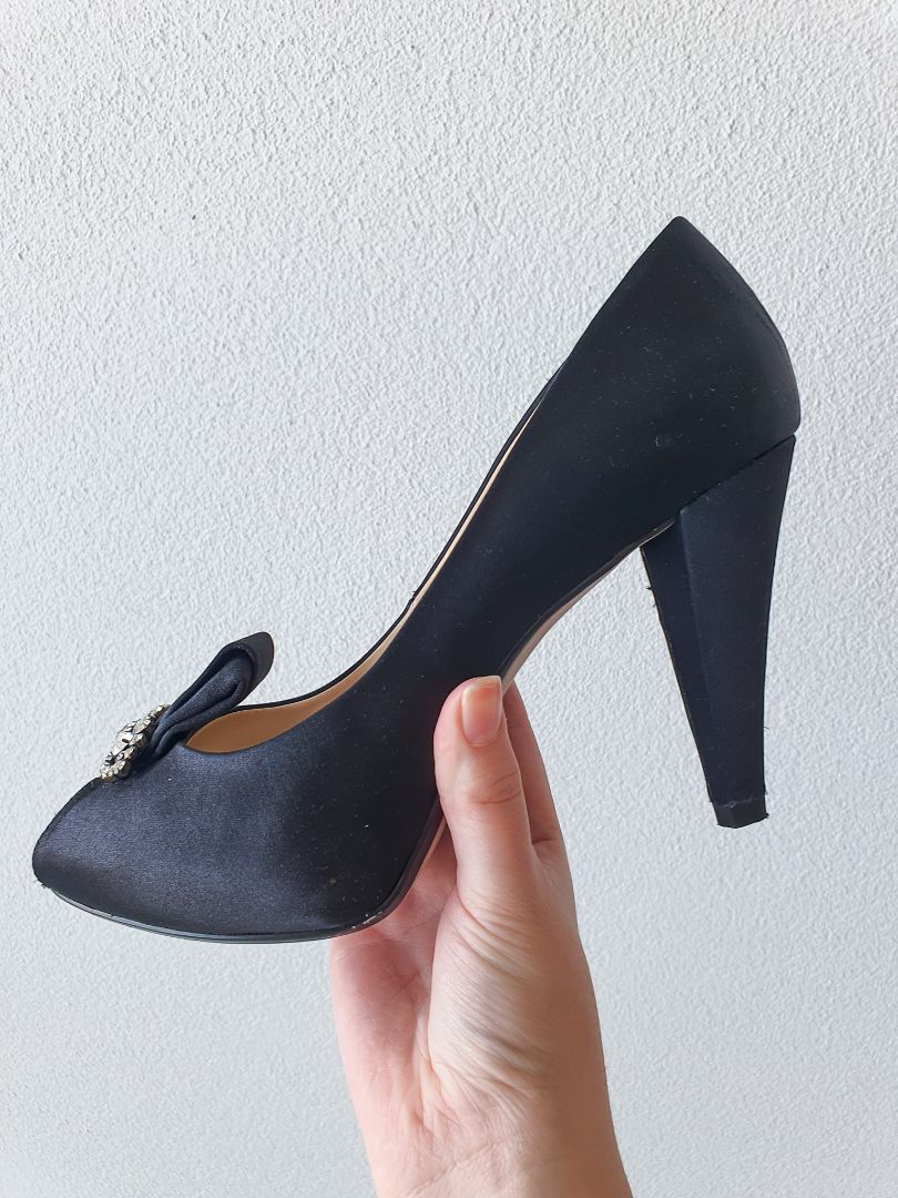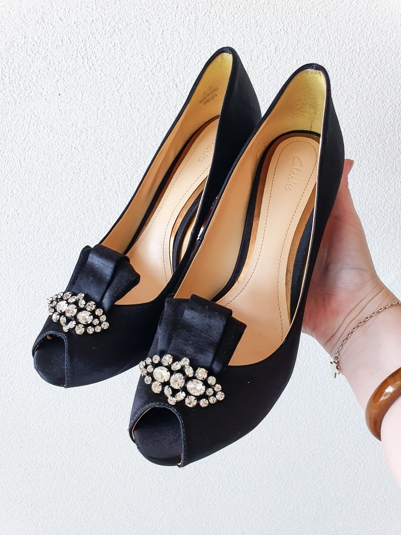 Padded diamante black satin heels