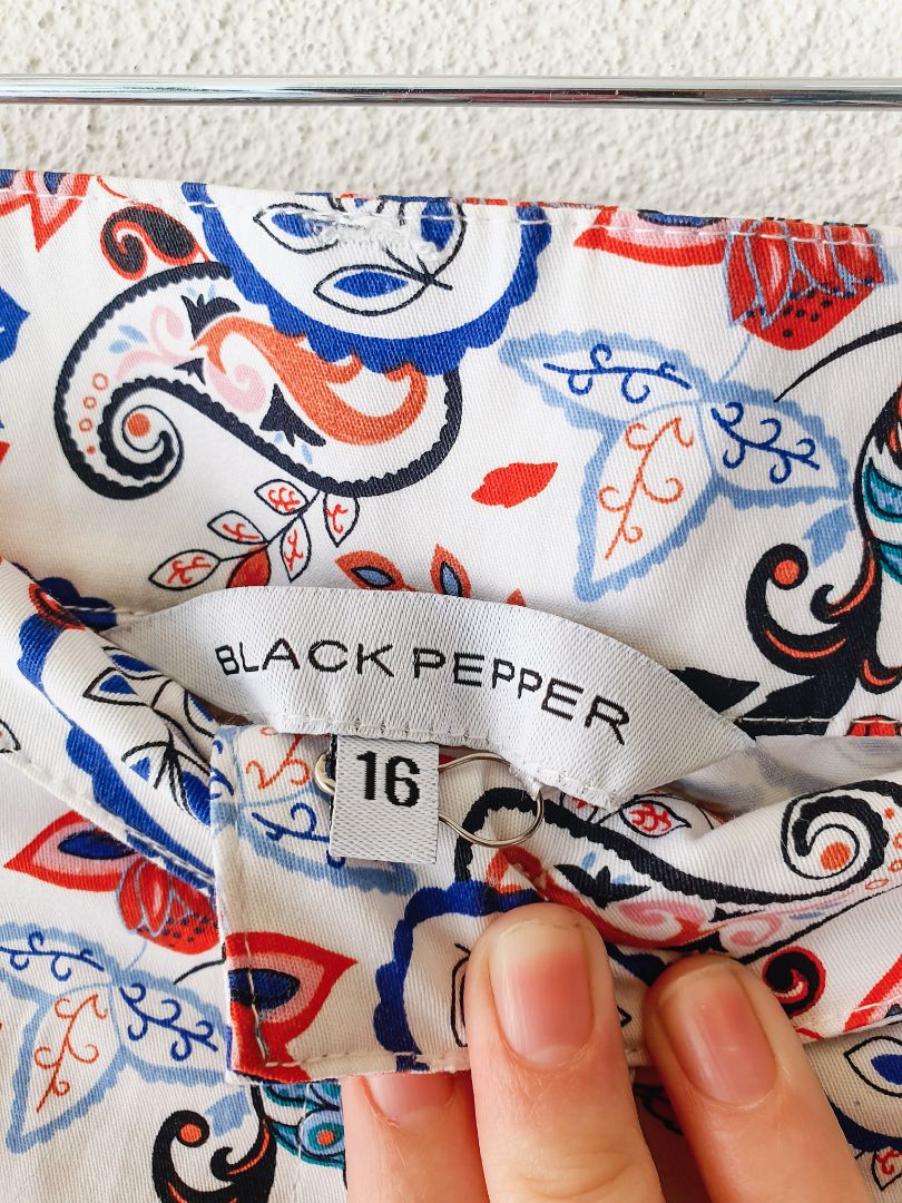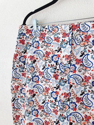 A timeless and comfortable skirt from Black Pepper, perfect for everyday wear. This straight-cut skirt features a delightful blue, red, and black filigree-style floral pattern on a white base. Made from comfortable, figure-flattering cotton with 2% spandex for stretch.
