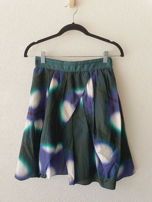 Make a unique style statement with this EGGS designer skirt! Crafted from 100% cotton and fully lined, this skirt features a rich deep forest green colour palette with artistic blue and sea green 'searchlight' patches. The design is cinched by a thick, ribbed waistband with three silver hook clasps and finished with an elegant asymmetric drape at the front. A standout, high-quality piece ready to wear.