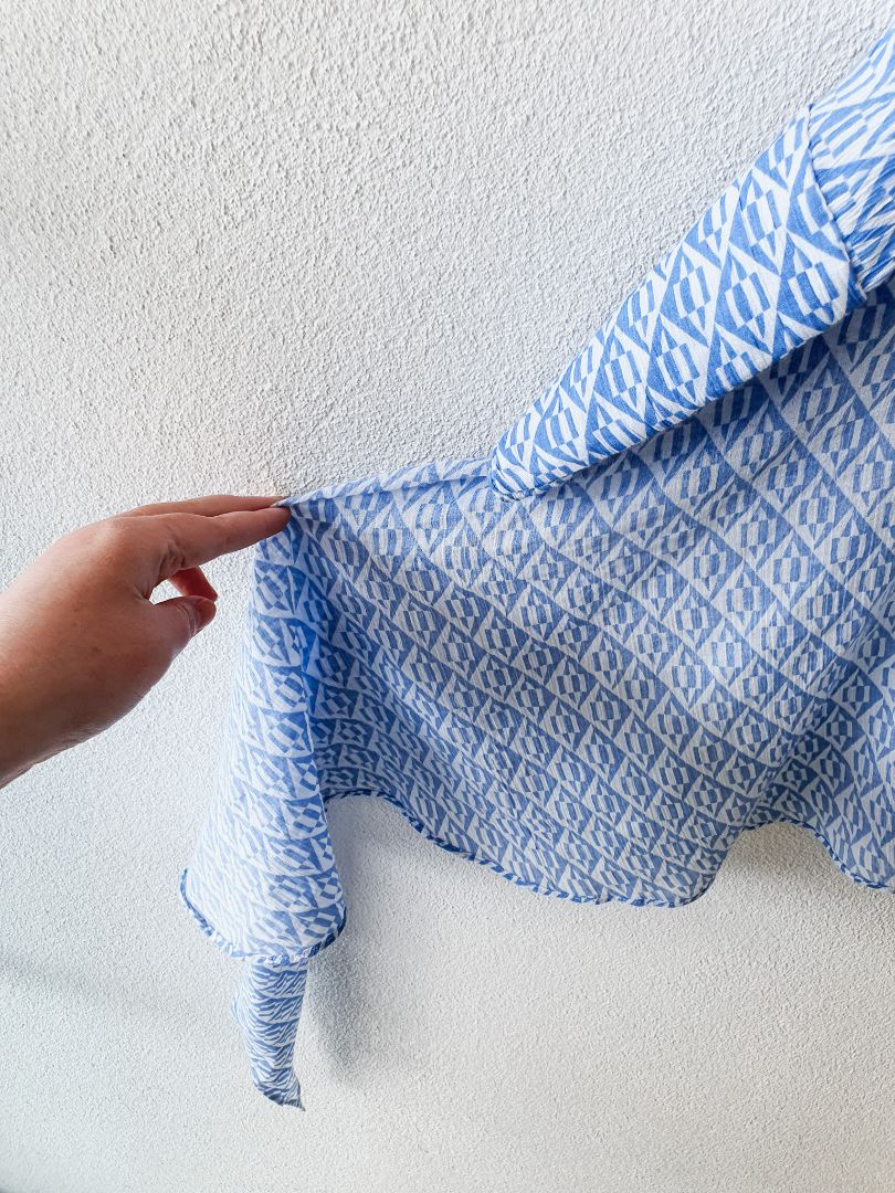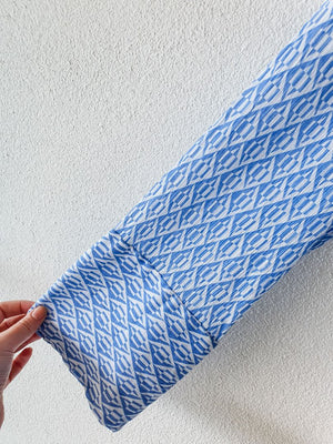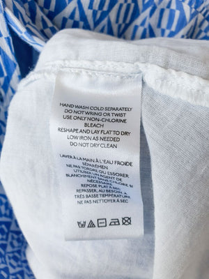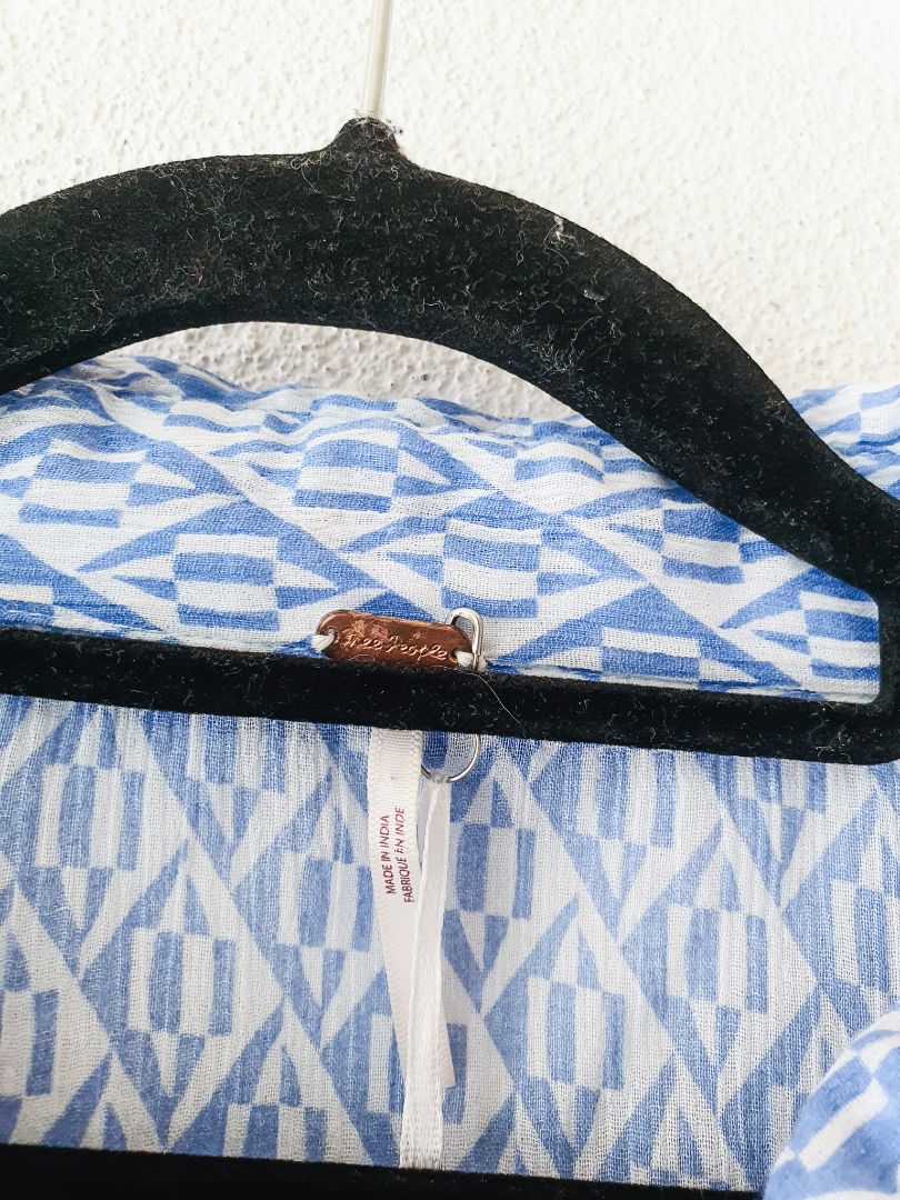 Beautiful authentic Free People blouse dress in crisp 100% cotton. Features a stunning white and blue geometric pattern with a low-sheer finish (perfect for summer layering).
