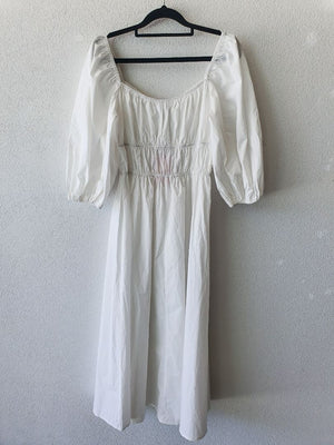 White puff sleeve maxi dress with gathered waist details.