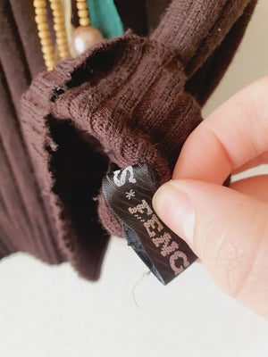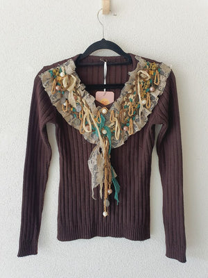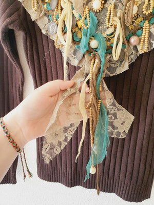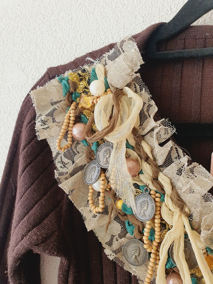 FEATURES: front decorated with coins, pearls, wooden beads, ribbon, and lace
