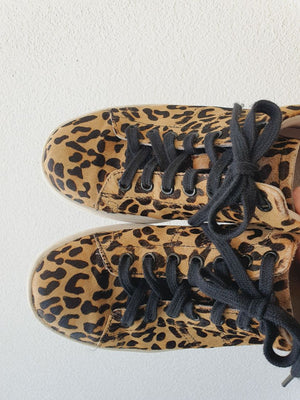Liam Leather Fur Leopard Animal Sneakers. Step out in comfort and style with these genuine leather-lined Witchery Liam sneakers featuring a statement leopard-print calf hair upper. They have classic black laces and chunky white rubber soles.