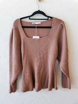RIBBED LONG SLEEVE SQUARE-NECK TOP - NUDE