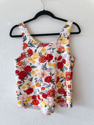 cute floral camisole with a fresh and cheerful feel. The vibrant flower print and soft scalloped edges give it a sweet, romantic charm, while the lightweight design makes it perfect for warm days or layering.