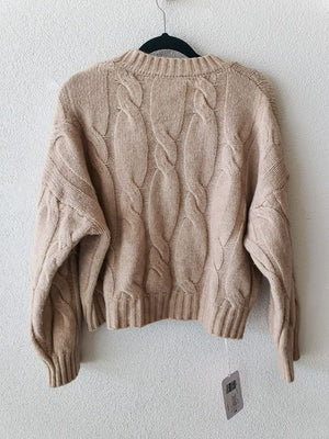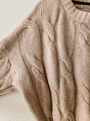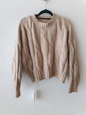 warm and cozy knit sweater with a cable-knit design. Its soft texture and relaxed fit make it perfect for staying comfortable on colder days.
