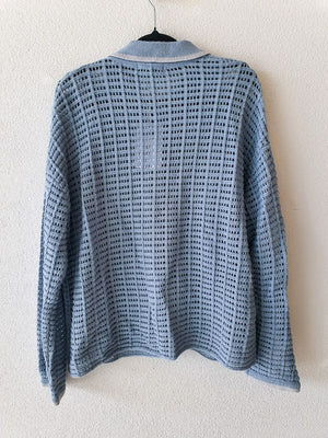 stylish knit cardigan from the Japanese brand Urban Research, featuring a soft blue tone and a relaxed, modern silhouette. The textured open-knit design adds a light and airy feel, while the collar and front pockets give it a polished yet casual touch. Comfortable, versatile, and effortlessly chic, it is the perfect layering piece for an elegant everyday look.