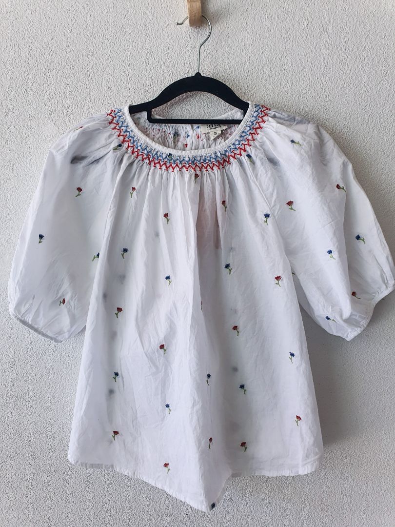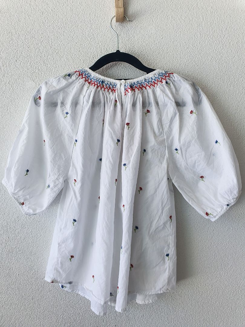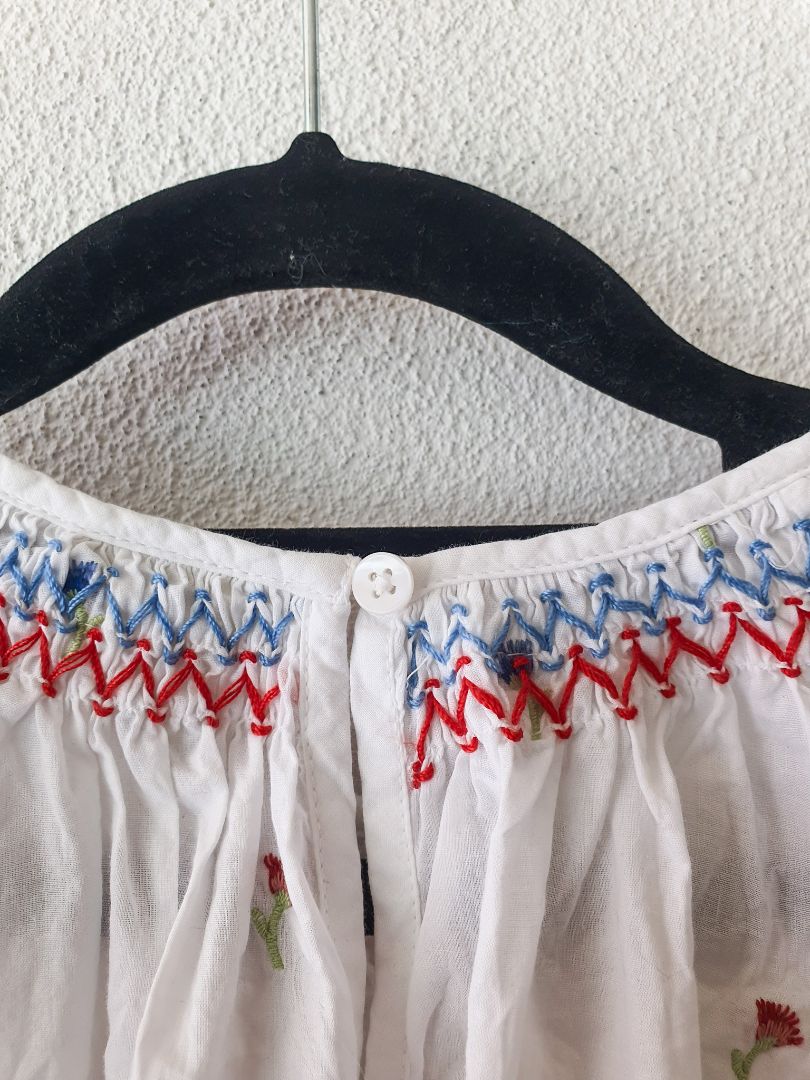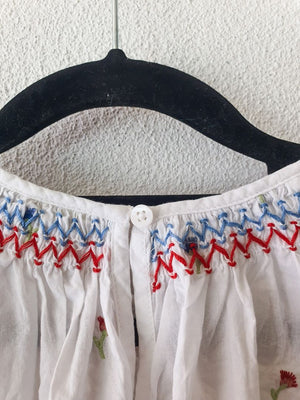 White puff sleeve blouse with cute red and blue flower details and neckline.